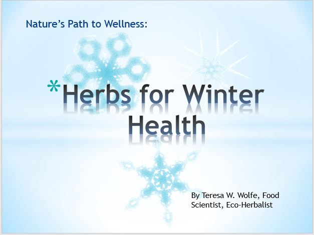 Eco-Herbalist Teresa Wolfe offers simple to use, down-home advice for these winter challenges and offers other natural alternatives to aid your immune system this winter. Program length: 1-1.5 hrs.